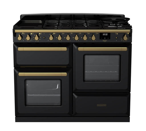 Sale price €3,829.00 Regular price €4,499.00Unit price /UnavailableBackorderedRangemaster Estel Deluxe 110cm Dual Fuel Range Cooker - Gloss Black & Brass | ESDLO110DFPGBL/AB1