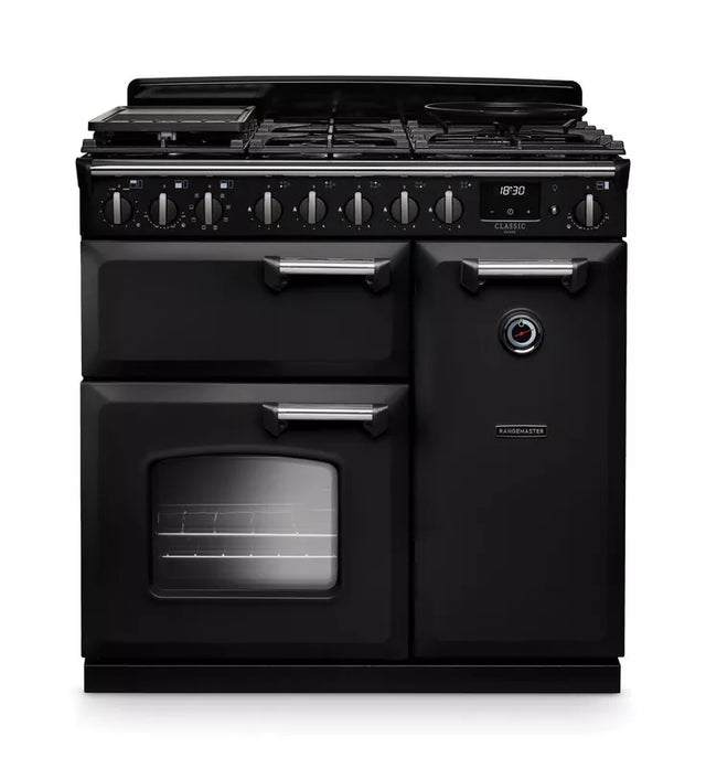 Rangemaster Classic Deluxe 90cm Dual Fuel Range Cooker - Charcoal Black & Chrome | CLDL90DFPCBL/CM1 is backordered and will ship as soon as it is back in stock.