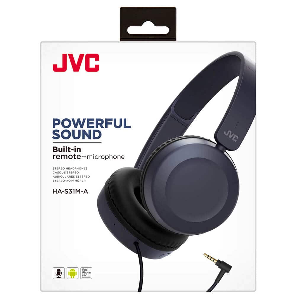 JVC Powerful Sound On-Ear Headphones combine lightweight comfort, integrated remote & microphone, and swivel foldable design for casual everyday listening. Soft ear pads provide long-lasting comfort while the single-sided cable reduces tangling. The built-in remote allows easy control of music playback and calls.