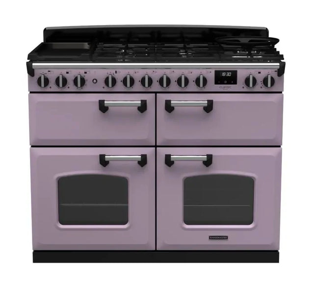 Rangemaster Classic Deluxe 110cm Dual Fuel Range Cooker (Slow Cook) - Heather & Chrome | CLDLB110DFPHTH/CM1 is backordered and will ship as soon as it is back in stock.