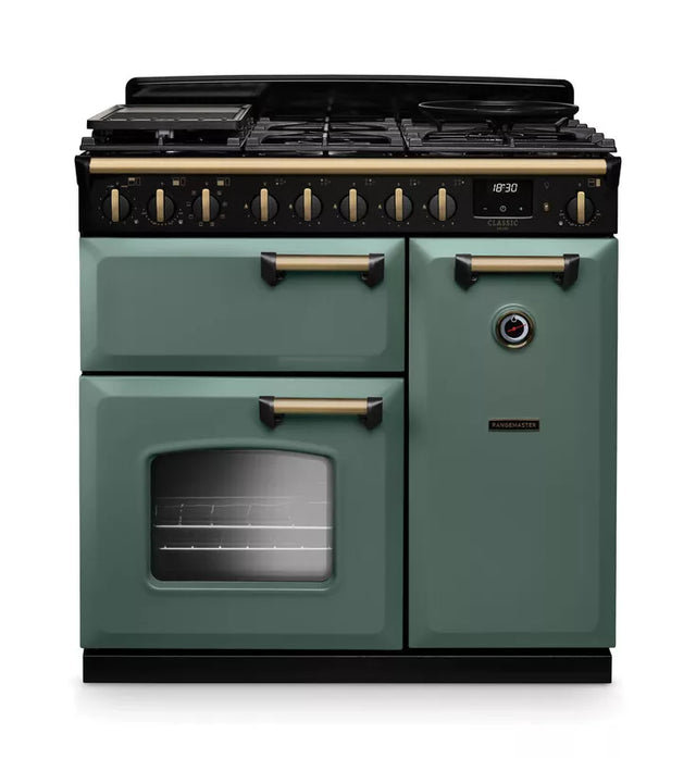 Rangemaster Classic Deluxe 90cm Dual Fuel Range Cooker - Mineral Green & Brass | CLDL90DFPMGR/AB1