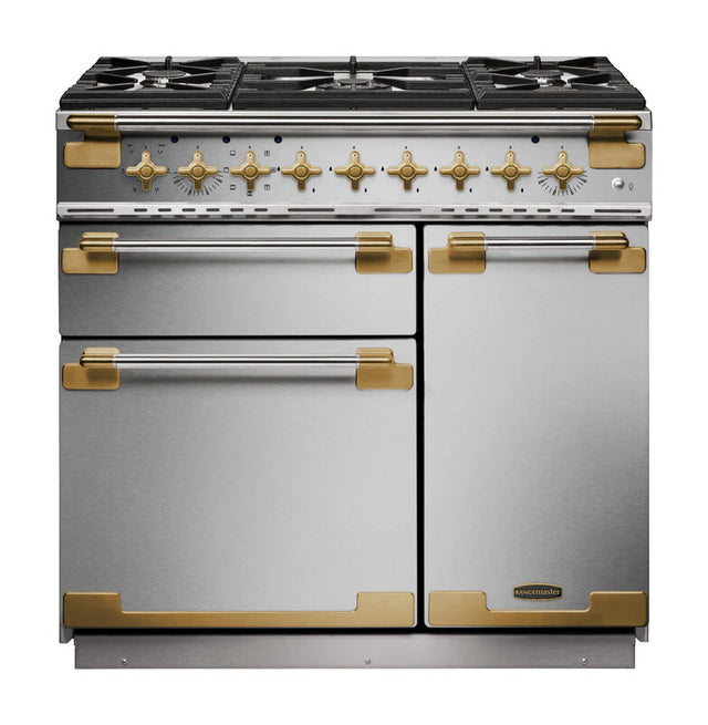 Rangemaster Elise 90cm Dual Fuel Range Cooker Black Edition - Stainless Steel & Brass | ELS90DFFSS/AB is backordered and will ship as soon as it is back in stock.