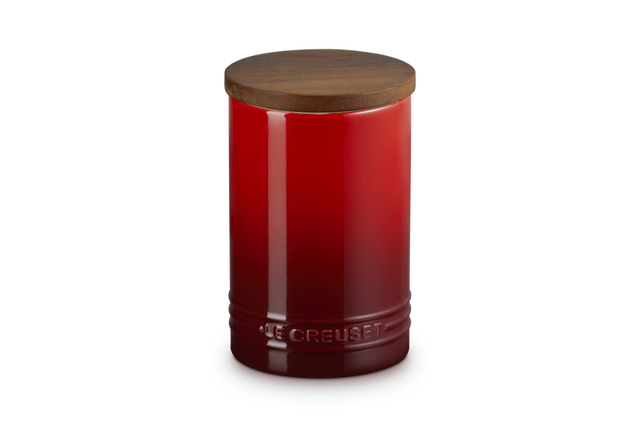 Le Creuset stoneware storage jar with Acacia wooden lid and silicone seal, ideal for keeping kitchen essentials fresh.