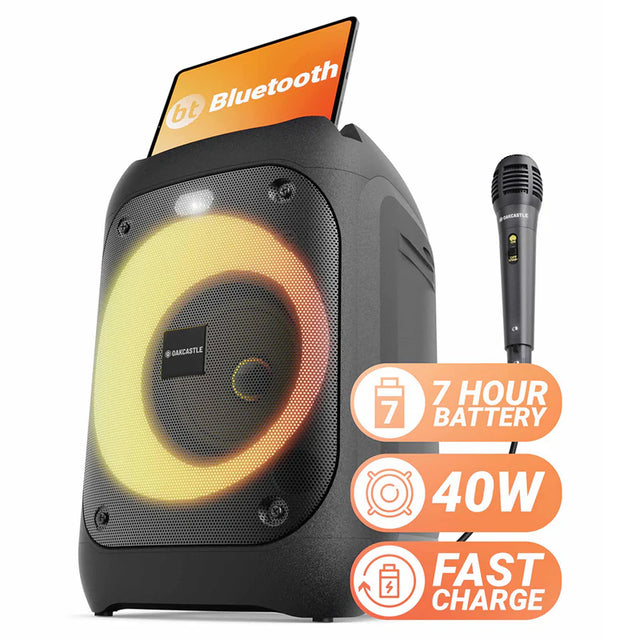 Oakcastle PS100 karaoke party speaker with 2.0 stereo sound, Bluetooth 5.0, LED light show, 7-hour rechargeable battery, and professional microphone.